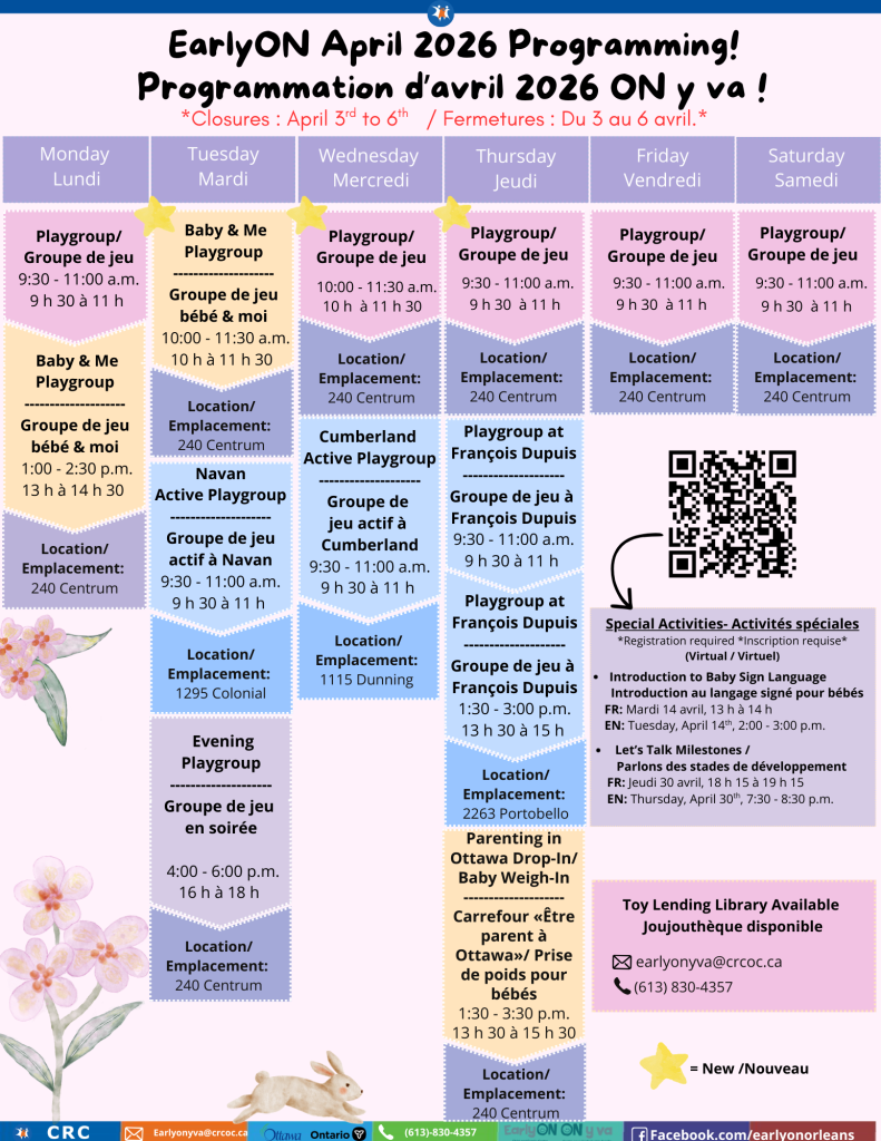 We will also be adding a new Thursday morning Playgroup at our main location from 9:30-11:00 a.m., running at the same time as our playgroup at François Dupuis Recreation Centre.