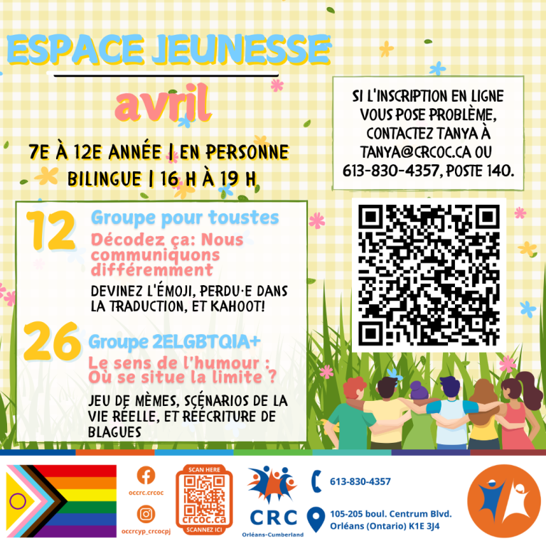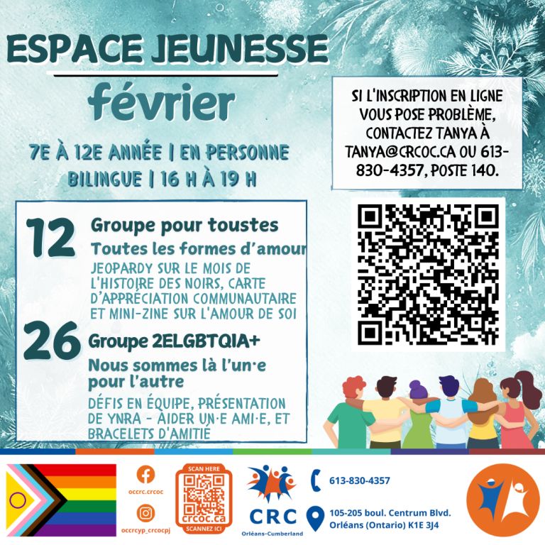 Le thème de février sera : L’AMOUR AU-DELÀ DE LA ROMANCE! L’amour ne se limite pas aux relations amoureuses. Joignez-vous à nous pour explorer l’amour de soi, l’entraide communautaire, l’amitié, l’empathie et le soutien mutuel, tout en développant des compétences pratiques pour créer des liens, renforcer la confiance en soi et améliorer le bien-être émotionnel.