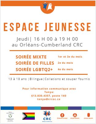 Pour plus de renseignement veuillez communiquer avec Rosanne Canzanella rosanne@crcoc.ca 613-830-4357 x307 https://www.crcoc.ca/fr/jeunesse/espace-jeunesse/