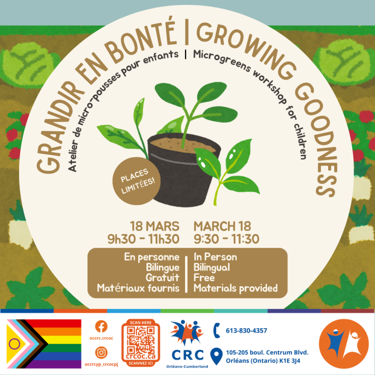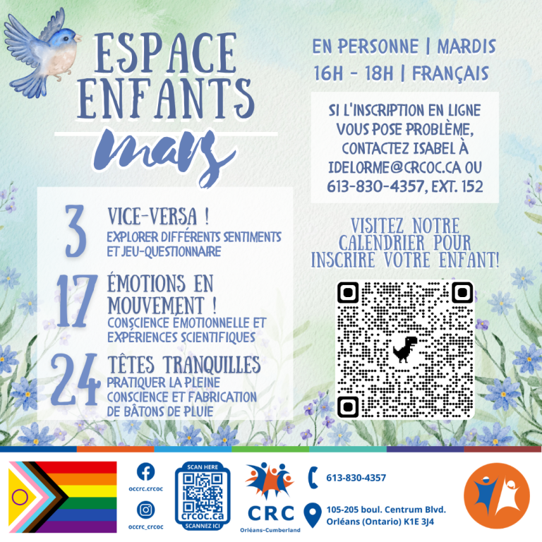 L’inscription ouvre le lundi de la semaine précédente à 8 h 30 et fermera le jour de l’activité à midi. Si l’inscription en ligne vous pose problème, veuillez envoyer un courriel à Isabel ou appeler 613-830-4357, poste 152.