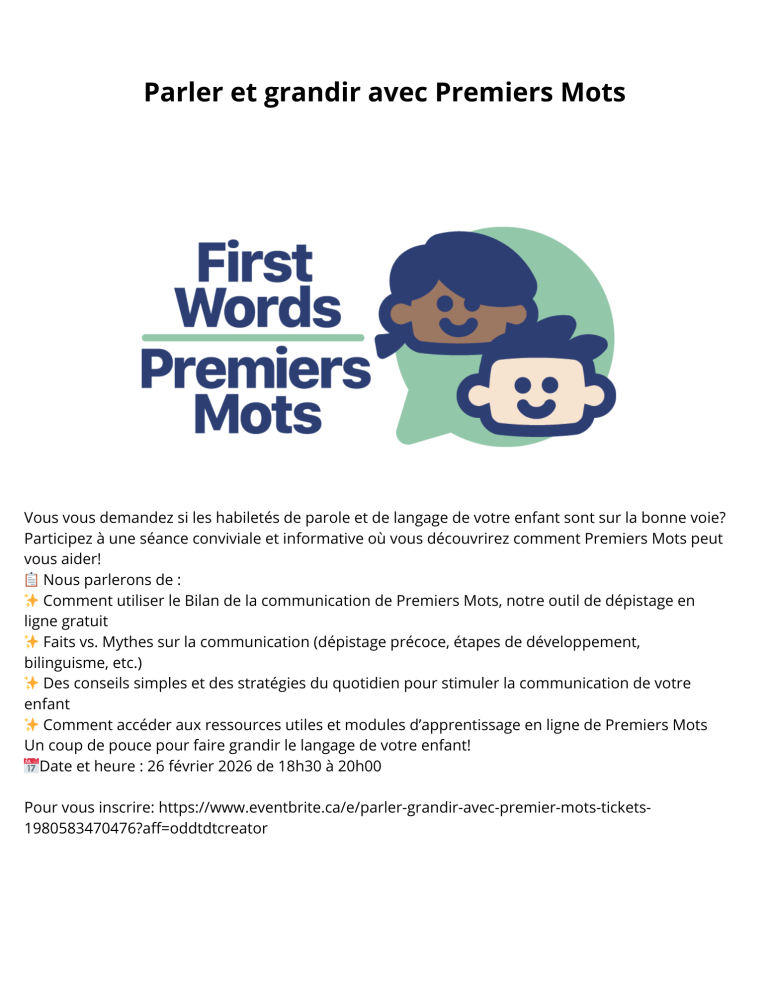 Premiers Mots est le programme préscolaire de la parole et du langage d’Ottawa et du comté de Renfrew. Nous aidons les familles d’enfants d’âge préscolaire d’Ottawa et du comté de Renfrew à atteindre leur développement optimal de la communication en offrant des services gratuits en orthophonie. Notre objectif est de sensibiliser la communauté et de faciliter la prévention, l’identification précoce et l’intervention afin d’assurer le développement précoce de la parole, du langage et de la communication globale chez les jeunes enfants d’Ottawa et du comté de Renfrew.